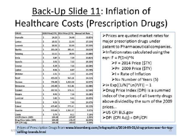Heather Bresch and Martin Shkreli just went in harder and did more damage. This has been an ongoing trend in the pharmaceutical industry at least since 2007. This slide from a presentation I did at work a couple of years back draws on research done by Bloomberg News and puts it in perspective contra the rate of inflation imagined by The US Bureau of Labor Statistics.