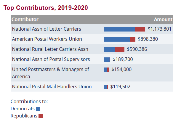 There are multiple postal unions: APWU, NALC, UPMA, NPMHU, NAPS, and NRLCA. All of them give heavily to Leftist candidates: