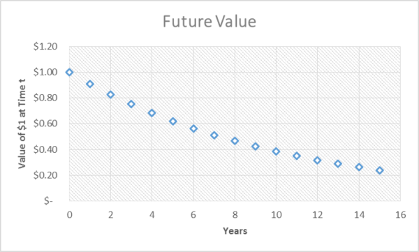 A’n is the original value of the dollar. I is the rate of inflation and n is the number of time periods.  So a 10% rate of inflation would make a $1 have a real value (Pn) of about 91 cents. If n represents your time preference, next year is only 91% as valuable as last year. We can draw a chart of how much future time is devalued with a 10% time preference.