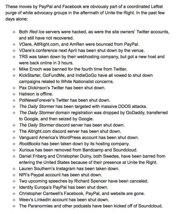 In fact, this is part of a wider pattern of mainstream media — including social media, which has now bought into the industry — censorship of Right-wing and white-wing thinkers since what I have called the Alt Right’s victory at Charlottesville. I call this a victory because it forced the Left to admit solidarity with Antifa, and despite media wailing about neo-Nazis and “car terrorism,” this is media hype and will be dead in two weeks, while the message the Alt Right sent will remain: you will not erase us; we have a right to a history, culture, heritage, values, symbols and most of all, to act in self-interest for our self-determination as well. And we owe you nothing.