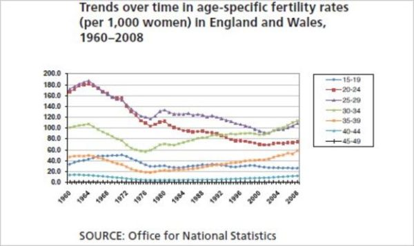 The story of this graph is the purple line – women aged between 25 and 29. Fertility rates had been falling inexorably since 1980 and then in 2001 the trend reverses. It is almost as if women in their late twenties realised the thirty-somethings were overtaking them in the baby-stakes and decided to get breeding.