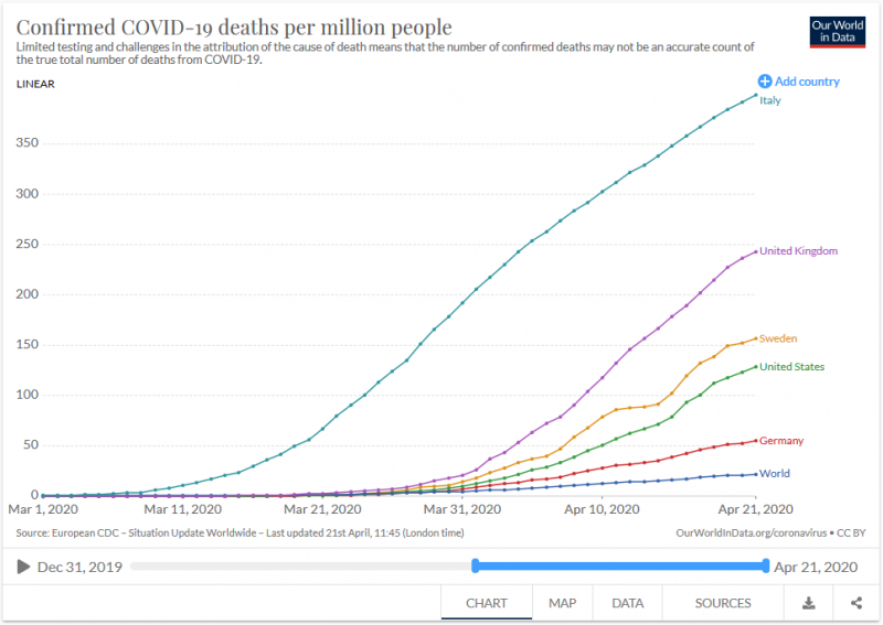 As of Sunday, Sweden had reported 1,540 deaths tied to Covid-19, an increase of 29 from Saturday. That’s considerably more than in the rest of Scandinavia, but much less than in Italy, Spain and the U.K., both in absolute and relative terms.